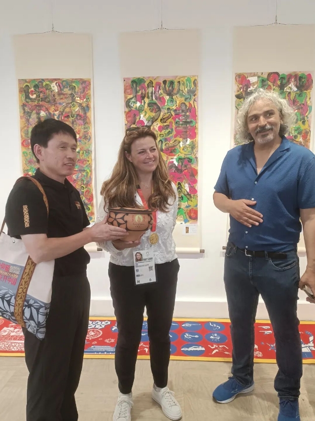 7月25日,在法國(guó)巴黎,來(lái)自三門峽市的王新軍(左)與現(xiàn)代奧林匹克運(yùn)動(dòng)會(huì)之父顧拜旦的曾孫女黛安·德·納瓦塞爾·德·顧拜旦夫人(中)進(jìn)行文化交流。王新軍作為仰韶彩陶制作技藝的領(lǐng)軍人物,他精心制作了“花開奧運(yùn)”經(jīng)典彩陶盆與廟底溝花瓣紋彩陶盆,參加此次巴黎奧運(yùn)文化體育交流活動(dòng)。